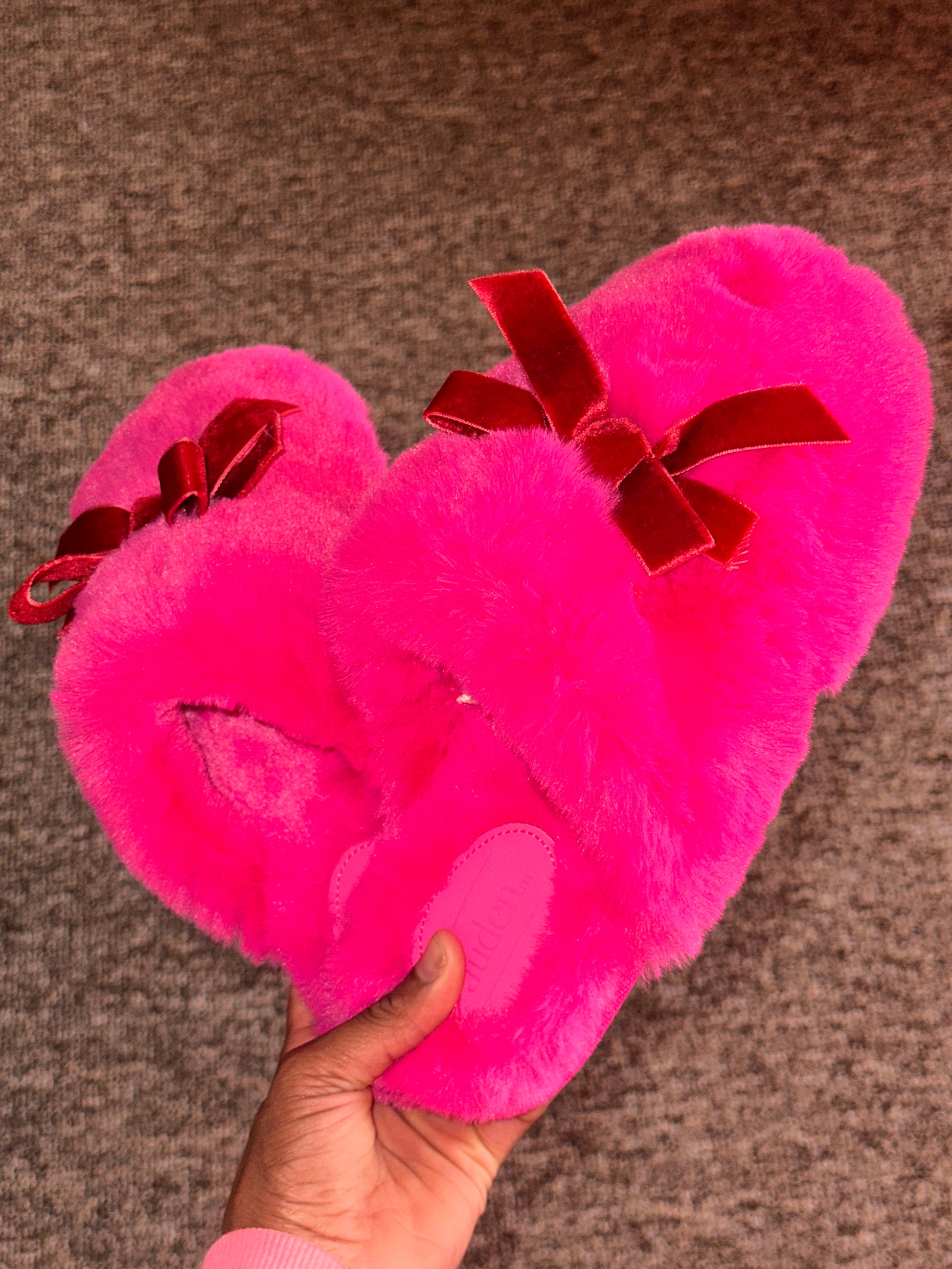 Brand new, soft, fluffy hot-pink slippers with velvet bows — super cozy and girly. Perfect for lounging in style.